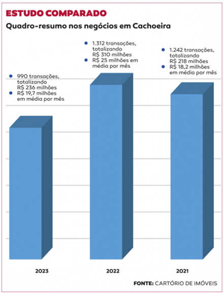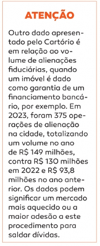 De acordo com levantamento feito pela equipe do Cartório ao JP, 2022 foi o melhor ano para o mercado imobiliário local em volume de transações. Foram 1.312 negociações, que movimentaram R$ 310 milhões — uma média de R$ 25 milhões por mês. Um dos destaques daquele ano foi a venda de um dos imóveis mais valorizados do Centro na história recente da cidade: o Shopping Orlando, adquirido pelo empresário santa-cruzense Gerson Tolotti. Embora o valor final da negociação não tenha sido divulgado, o preço pedido pelo imóvel era de R$ 3 milhões.
